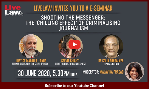 • Live Law Invites you to a Mega Webinar When: Jun 30, 2020 05:00 PM IndiaTopic: Shooting The Messenger: The 'Chilling Effect' of Criminalising JournalismPanelistsJustice Madan LokurSeema Chishti, Deputy Editor, Indian ExpressColin Gonzalves, Senior AdvocateModerator : Malvika PrasadYouTube Link: https://www.youtube.com/watch?v=ulMX1u8s6iIFacebook Live:...