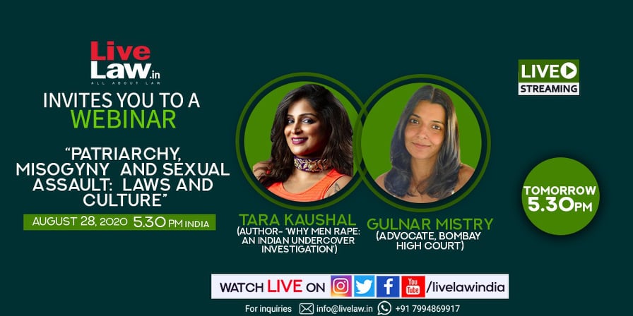 LiveLaw is organizing a webinar on August 28, 2010 at 5:30 pm.Topic:"Patriarchy, Misogyny & Sexual Assault: Laws and Culture"Tara Kausal , (Author of The Book - "Why Men Rape, an Indian Undercover Investigation ")In Conversation With Gulnar Mistry (Advocate, Bombay High Court)The Details of the webinar are as follows: Zoom...